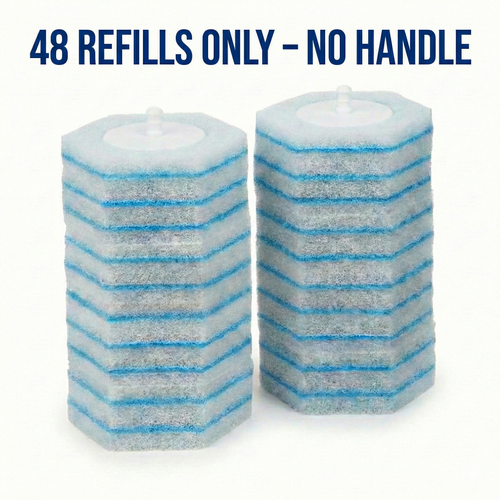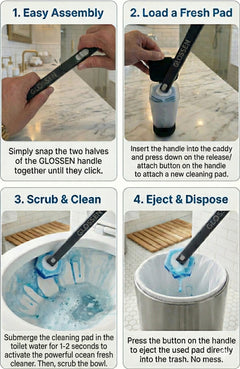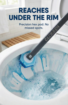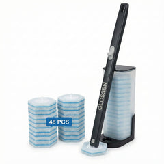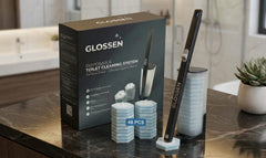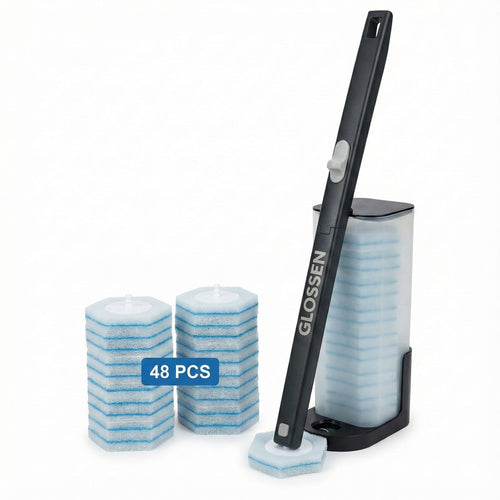 Upgrade your bathroom routine with the complete GLOSSEN toilet cleaning system, designed for touch-free hygiene, water-activated ocean-fresh blue foam, and effortless under-rim cleaning. Includes handle, storage caddy, and 48 disposable refill pads.